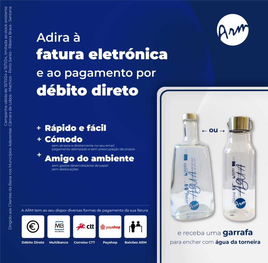 empresa Águas e Resíduos da Madeira (ARM) promove uma campanha para a adesão ao Débito Direto e/ou Fatura Eletrónica, dirigida aos seus clientes da baixa nos municípios aderentes à ARM, designadamente Câmara de Lobos, Machico, Porto Santo, Ribeira Brava e Santana, que decorrerá entre 15 de outubro de 2024 e 15 de novembro de 2024.